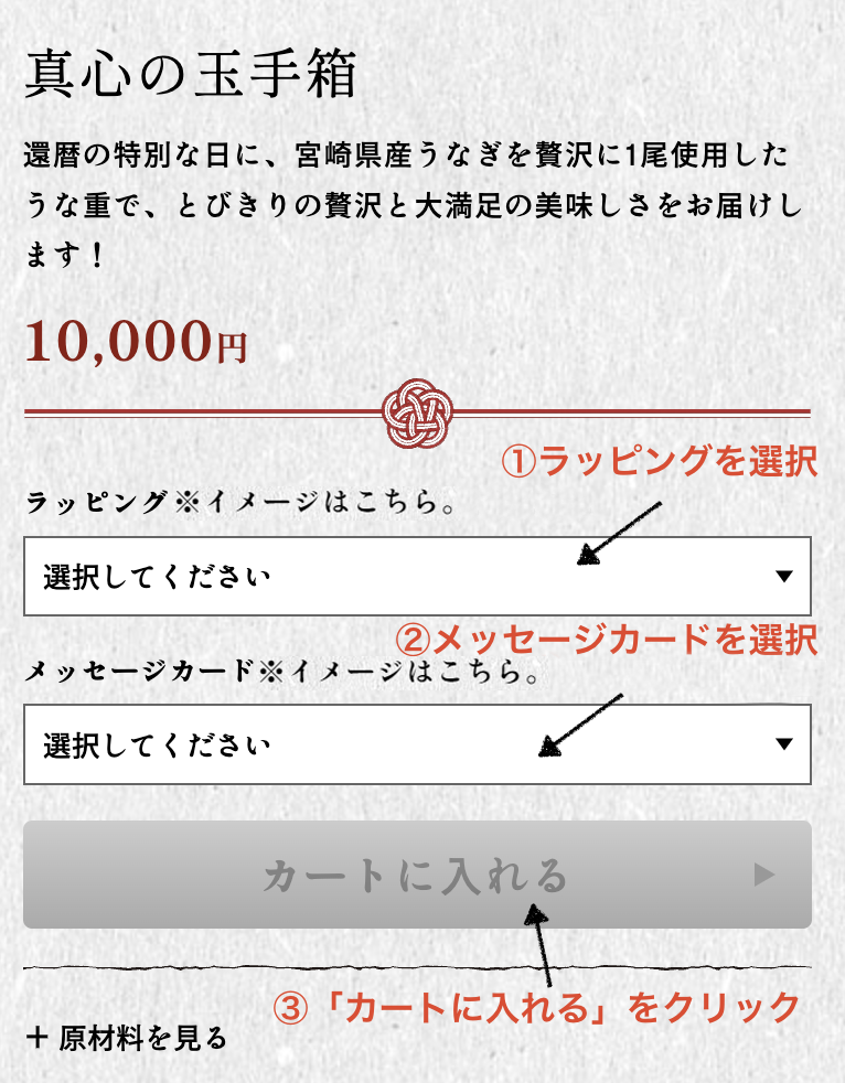 商品ページで、①ラッピング、②メッセージカードの有無を選択し③「カートに入れる」をクリック