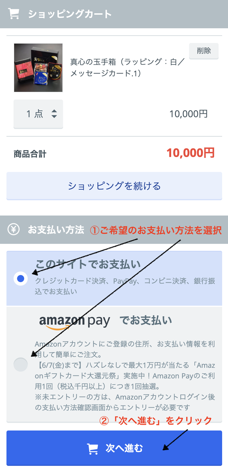 ショッピングカートでカートの内容を確認後、①ご希望のお支払い方法を選択(amazon payでは複数の送り先を設定することができないため、ご注意ください「このサイトでお支払い」であれば、複数の送り先に送ることが可能でございます)②「次へ進む」をクリック