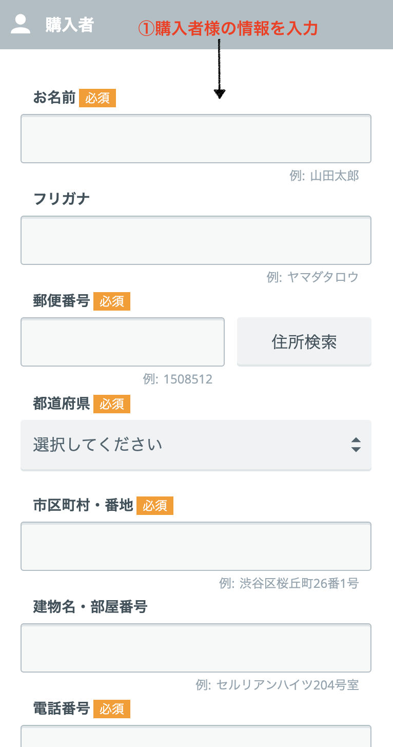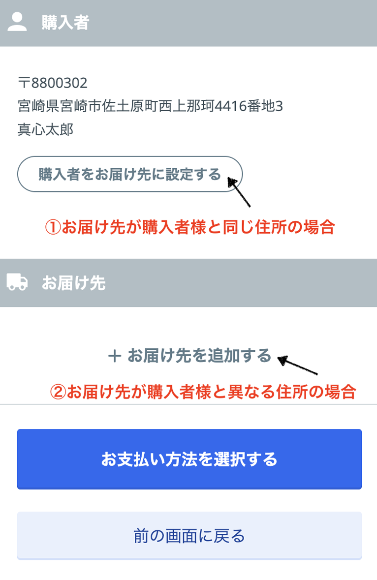 お届け先が購入者様と同じ住所の場合は①をクリック