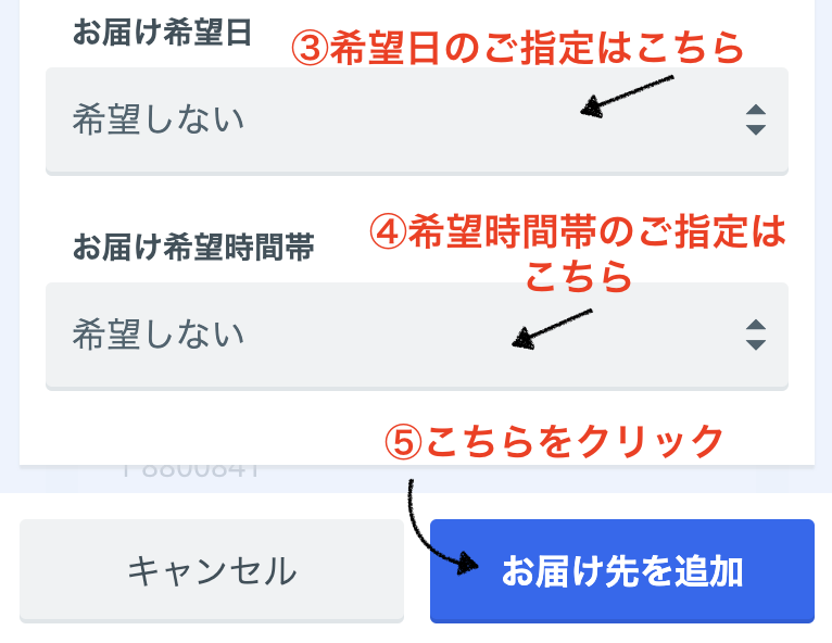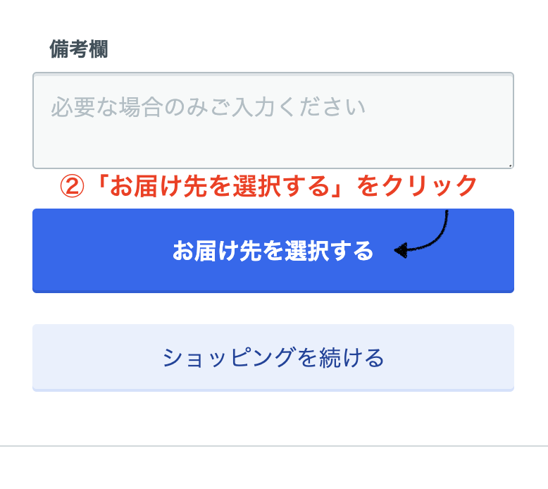 次にお届け先の情報を入力するため②「お届け先を選択する」をクリック