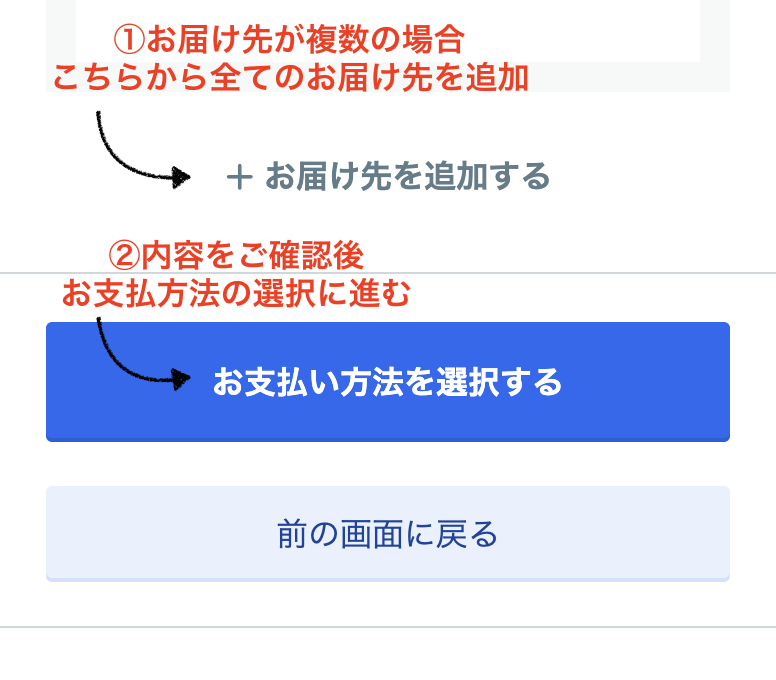 ①送り先が複数ある場合は、全てのお届け先を追加してください