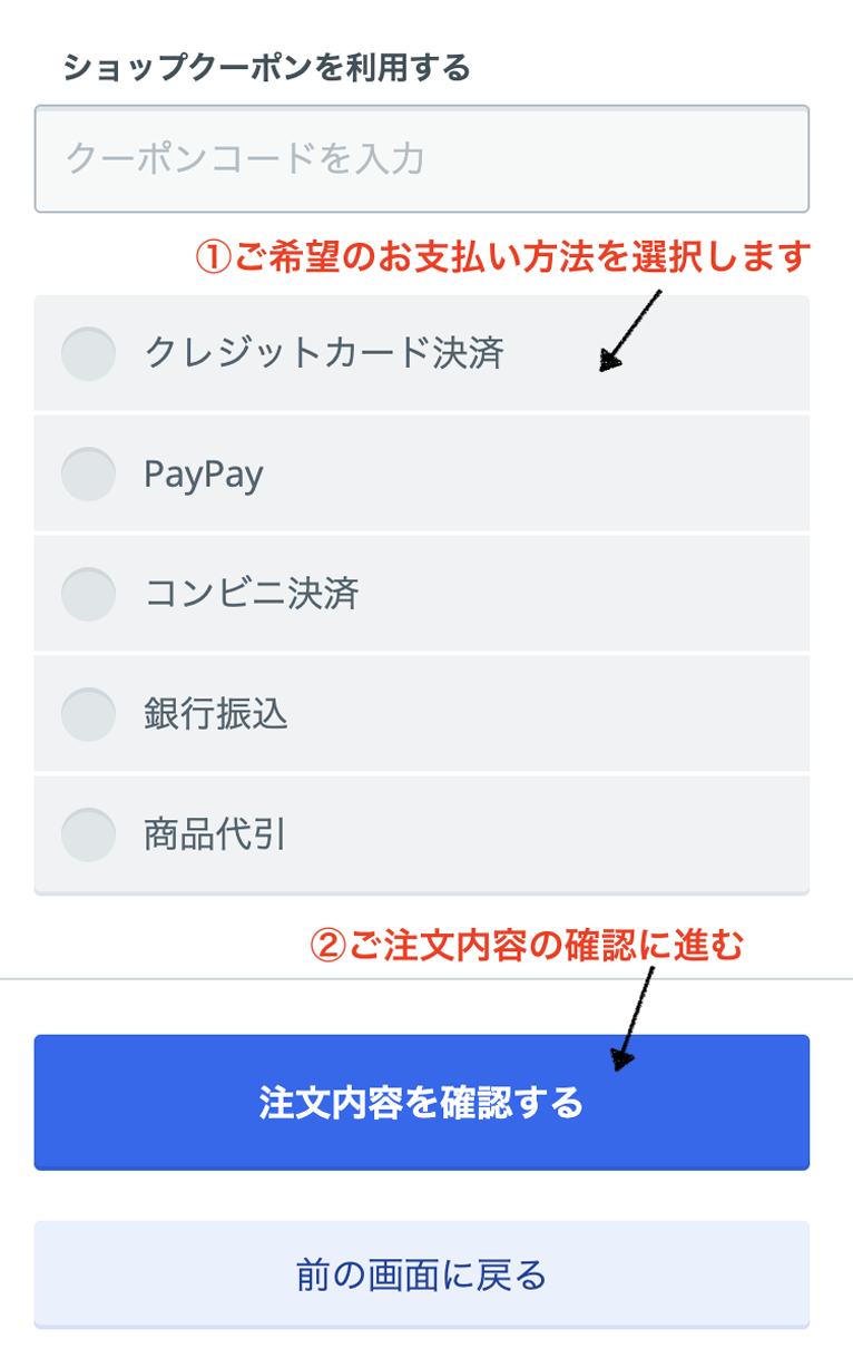①ご希望のお支払い方法を選択し決済情報を入力したら、②ご注文内容の確認に進みます