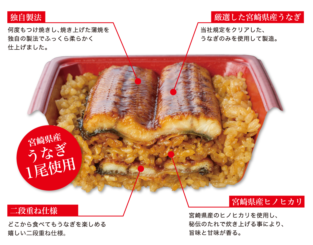 宮崎県産米、うなぎ(宮崎産)、本醸造醤油(大豆、小麦を含む)、発酵調味料、水あめ、砂糖混合ぶどう糖果糖液糖、みりん、砂糖、澱粉
